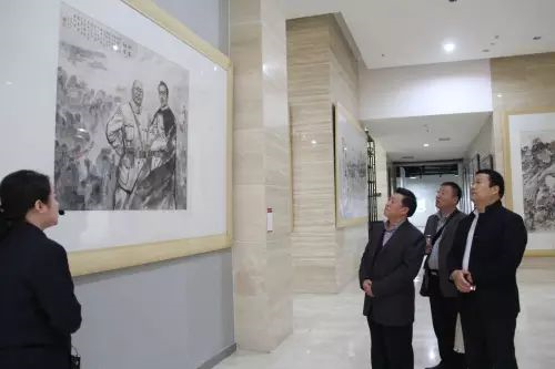 在清渭楼美术博物馆讲解人员的带领下,赵广发书记详细参观了清渭楼美术博物馆中国古代、中国近现代、中国当代书画展厅以及正在展出的第十一届中国艺术节“在希望的田野上——中国农民画精品展”。并了解了郭峰馆长重建清渭楼,将中国传统艺术与清渭楼融合发展,建设清渭楼美术博物馆的发展历程。在观赏著名国画家王西京的代表作品《千古功臣》时,郭峰馆长对作品创作过程进行了介绍,一行人饶有兴趣地倾听。