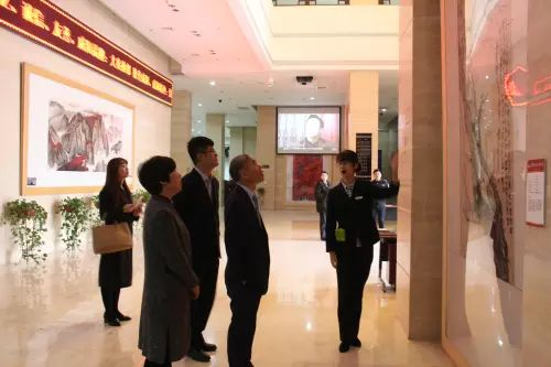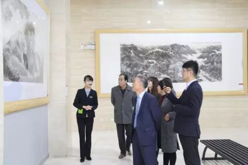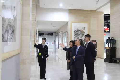 在李苏迎副主任的陪同下,李康国总领事一行先后参观了清渭楼美术博物馆中国古代、近现代和当代书画展厅,并深入美术博物馆学术交流区、办公区域参观。工作人员详细讲解了中国当代、中国近现代和中国当代书画展厅的书画艺术品,李康国总领事对中国书画艺术表现出极大的兴趣,参观期间不断向讲解员询问中国画技艺细节等问题,并且称赞清渭楼美术博物馆的展览设计、空间布局达到了国际一流水平。