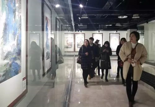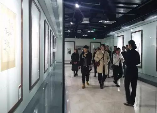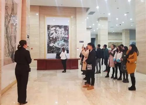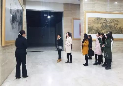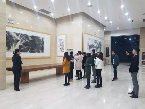 在讲解员的带领下员工们参观中国当代书画展览厅